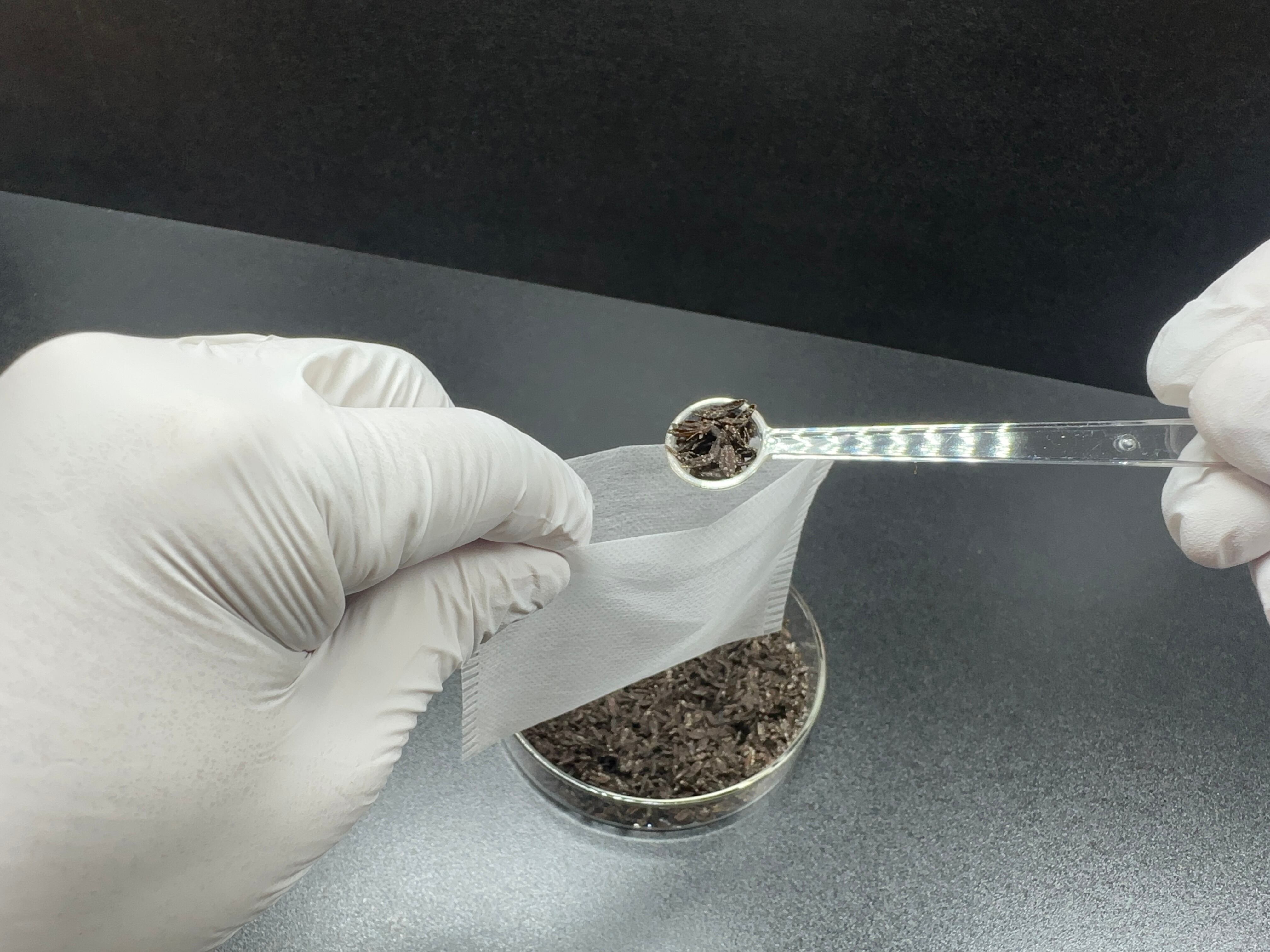 ③水出しパックの口を折り返し中身が出ないように ピンセットなどを使い水1ℓの中で2〜3分程度撹拌