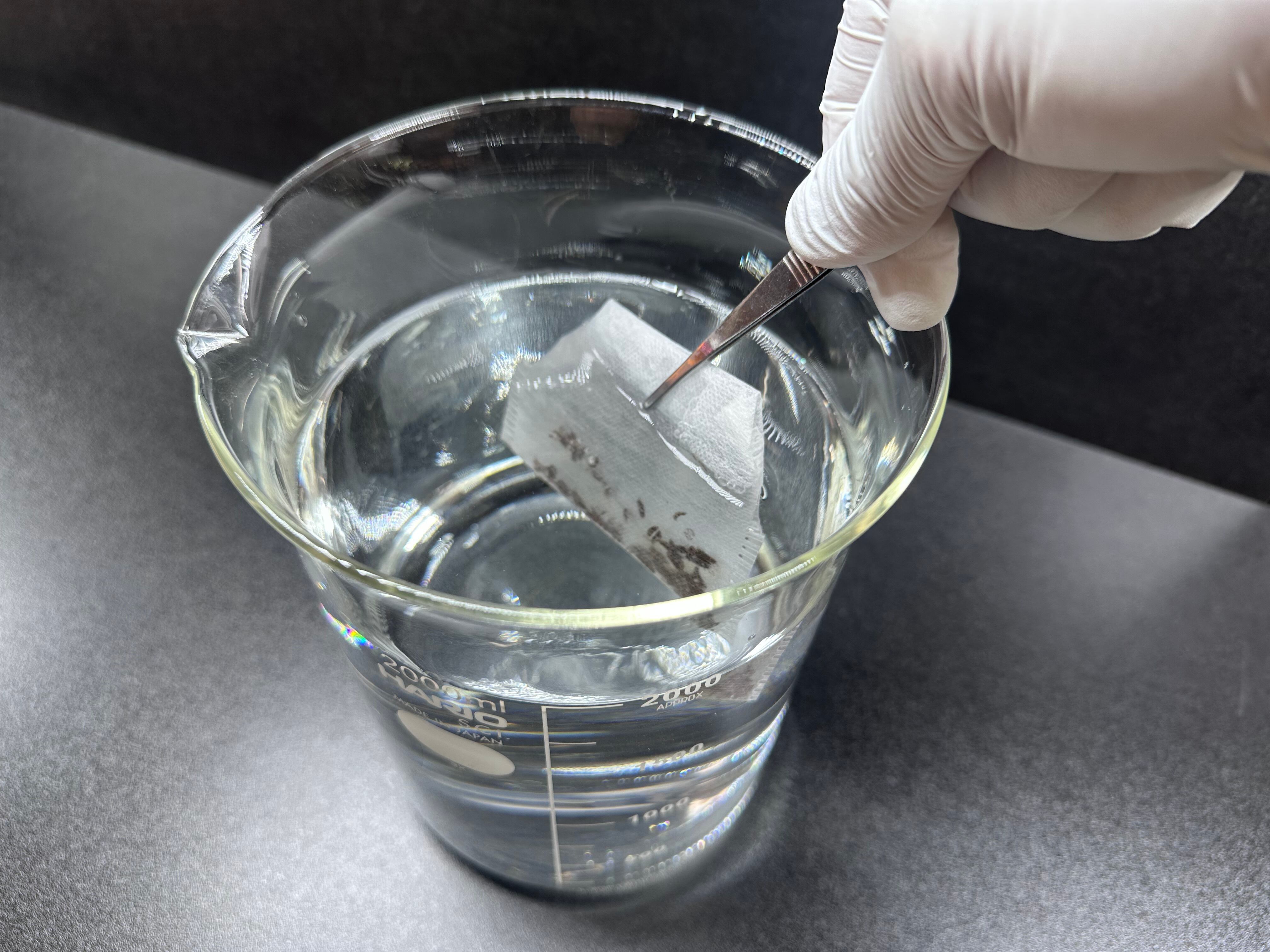 ③水出しパックの口を折り返し中身が出ないように ピンセットなどを使い水1ℓの中で2〜3分程度撹拌
