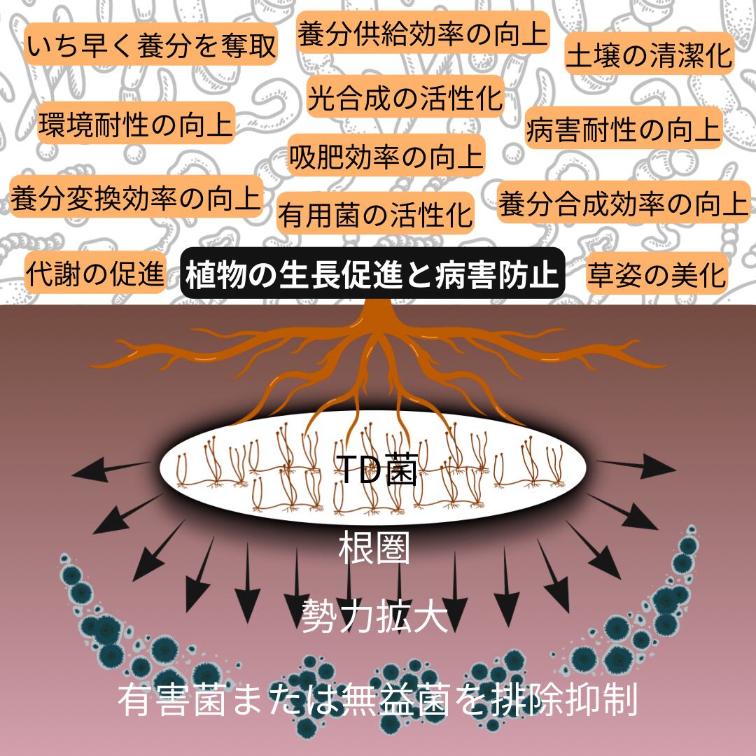 本菌によって有用菌の活動を阻害する植物の生長に不必要なその他の菌類を抑制し、あらゆる菌害を防止しながら有用菌の活性化によって狭い栽培空間でも自然に近い理想的な土壌環境にする事で植物の生長が促進され、株が持つ本来の強さを引き出しあらゆる環境耐性や病害に対しての抵抗力が高まり、真の健康体へと変化させる役割を果たします。
